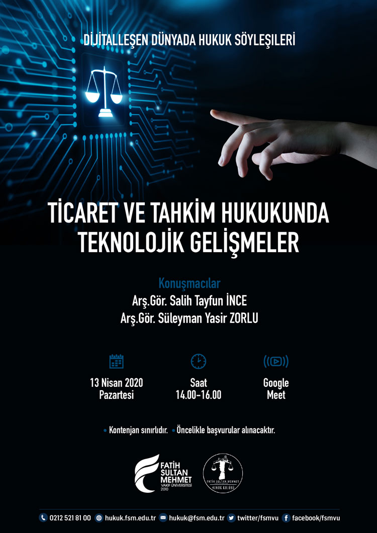 Hukuk Fakültesi ve Hukuk Kulübü işbirliğinde gerçekleştirilecek "Dijitalleşen Dünyada Hukuk" başlıklı söyleşilerin ilki 13.04.2020 tarihinde gerçekleştirilecektir.